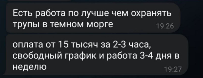 Выглядит как обычная подработка: грузчики, фасовщики, разовая уборка, помощь с ремонтом или реставрацией, “дам 5000 р сейчас, успевай”, муж на час, “оставить посылку в заданном месте”, заслуживающий внимания сортировщик рыболовных снастей, доставщик пищевой соли или человек посчитать трупов в морге (не хватает только вакансии раскапывать сфинкса).
