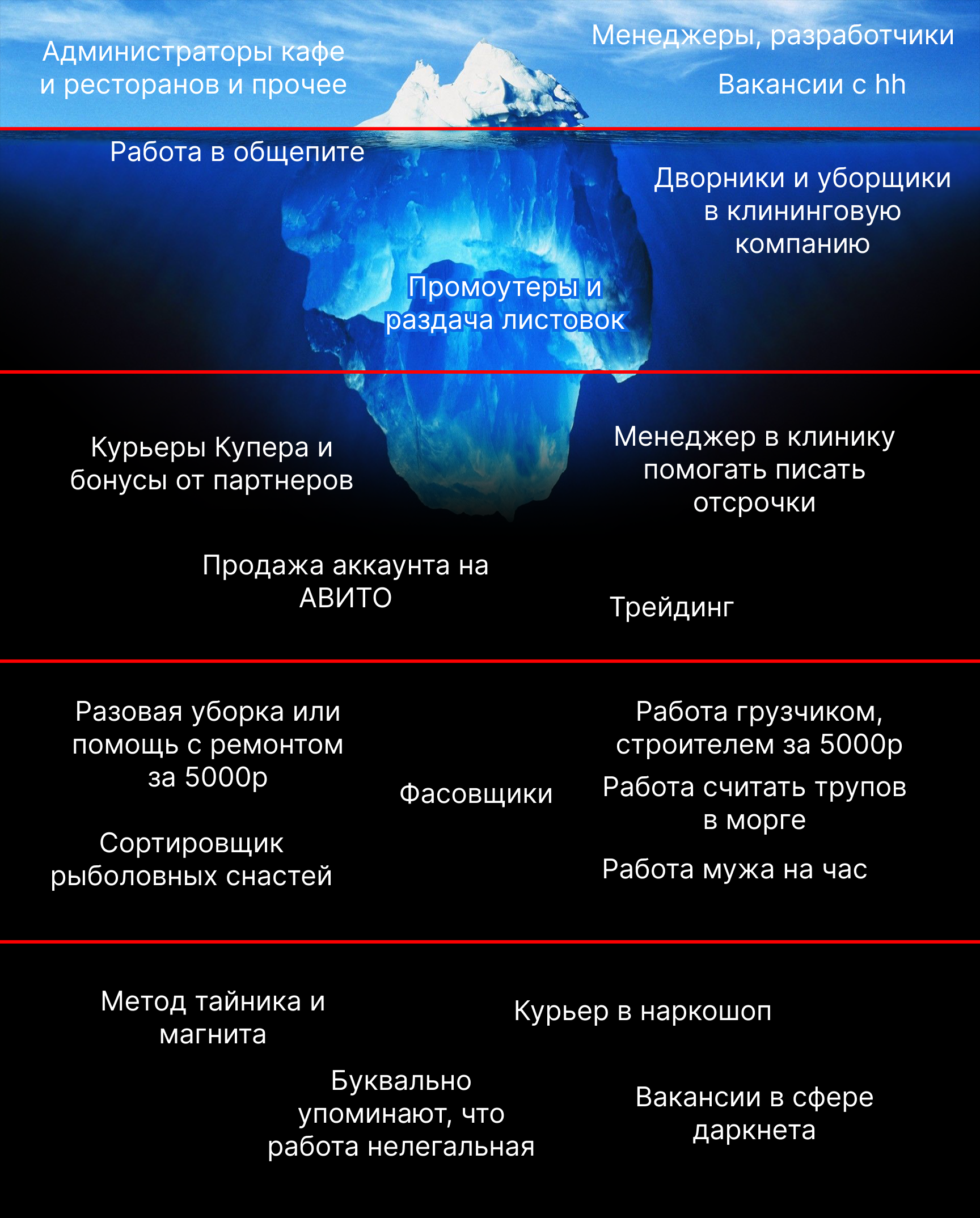 До этого уровня добраться несложно, но ничего приятного тут не увидеть, потому что в самом посте вакансии буквально упоминают “требуется курьер в наркошоп”, “вакансия в сфере даркнет”. Такие посты чаще всего намешаны с теми, что в предыдущем уровне айсберга, просто тут пишут БУКВАЛЬНО.